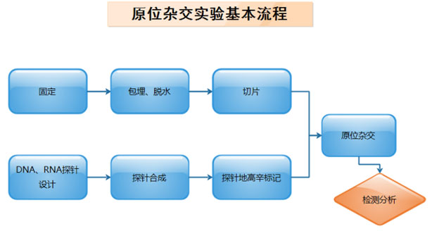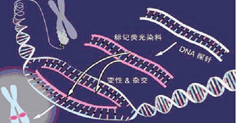 原位雜交技術(In situ hybridization,ISH)是利用核酸分子單鏈之間有互補的堿基序列,將有放射性或帶熒光等標記的外源核酸(即探針)與組織、細胞或染色體上待測DNA或RNA互補配對,結合成專一的核酸雜交分子,再以放射自顯影或免疫細胞化學方法對標記探針進行探測,將待測核酸在組織、細胞或染色體上的位置顯示出來。