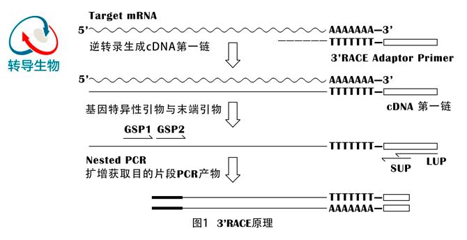 利用mRNA的3'末端的poly(A)尾巴作為一個引物結合位點,以連有SMART寡核苷酸序列通用接頭引物的Oligo(dT)30MN作為鎖定引物反轉錄合成標準第一鏈cDNA。然后用一個基因特異引物作為上游引物,用一個含有部分接頭序列的通用引物作為下游引物,以cDNA第一鏈為模板,進行PCR循環,把目的基因3' 末端的DNA片段擴增出來(圖1)。