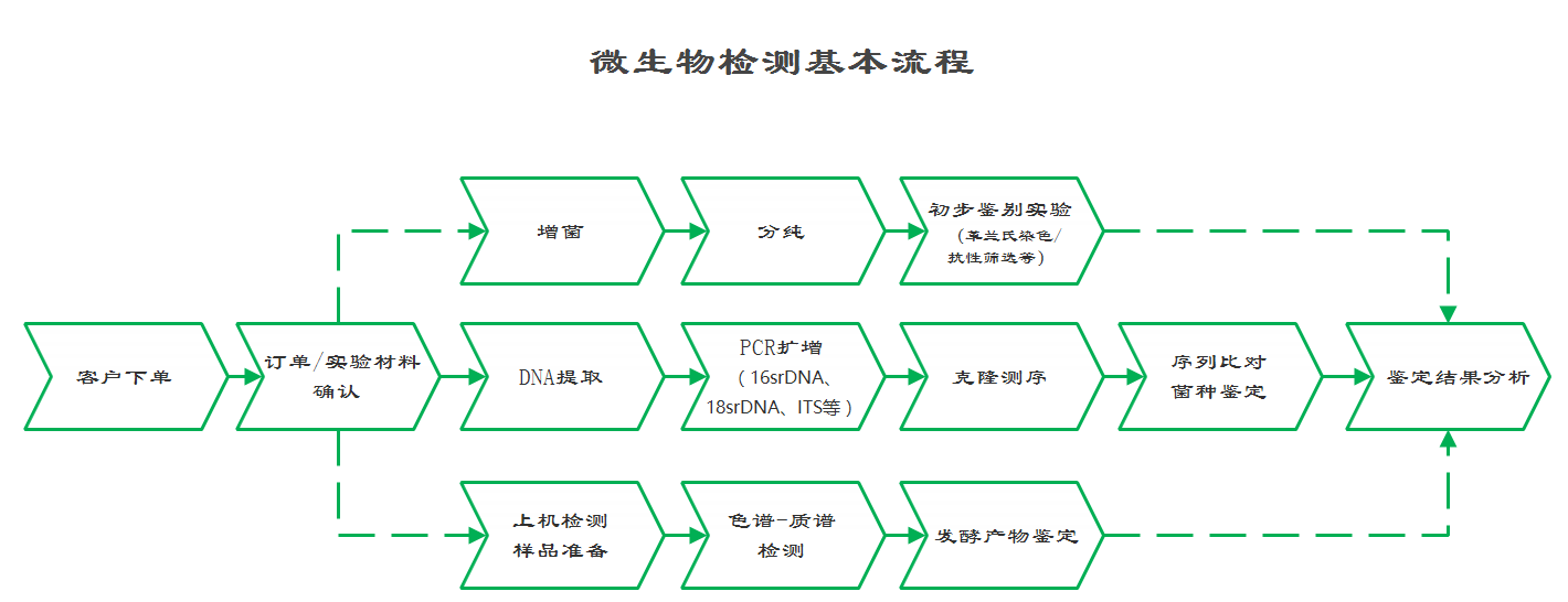 客戶在線下單-訂單/實驗材料確認——{1. 增菌——分純——初步鑒別實驗(革蘭氏染色、抗生素敏感性試驗等);2. DNA提取-PCR擴增(16srDNA、18srDNA、ITS等)——克隆測序——序列比對-鑒定結果分析