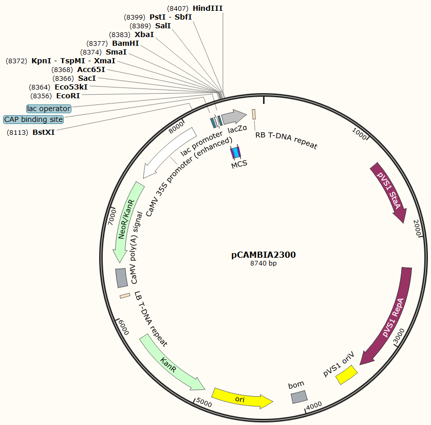 pCAMBIA系列載體是常用的植物表達雙元載體,載體的骨架是pUC18。其中 pCAMBIA1300, pCAMBIA2300均無gus報告基因,pCAMBIA系列載體均含有卡那霉素抗性基因。pCAMBIA2300特點:大腸桿菌篩選抗性卡那霉素,植物篩選抗性:新霉素。