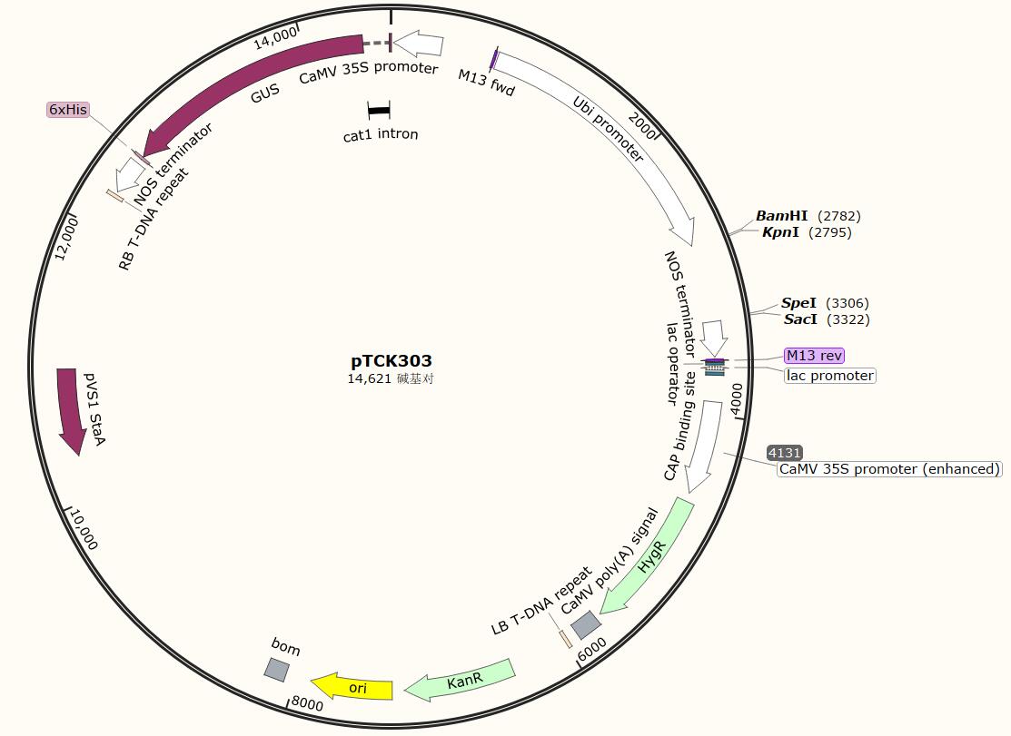 常用植物干擾載體,帶GUS與潮霉素序列,便于篩選與檢測。
