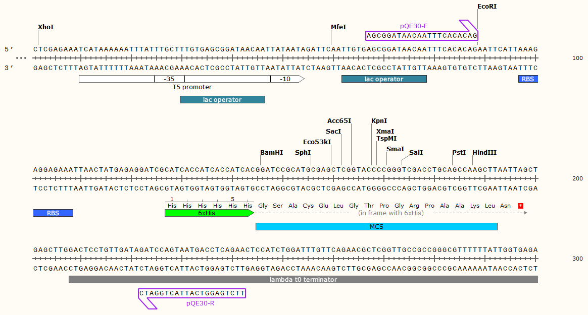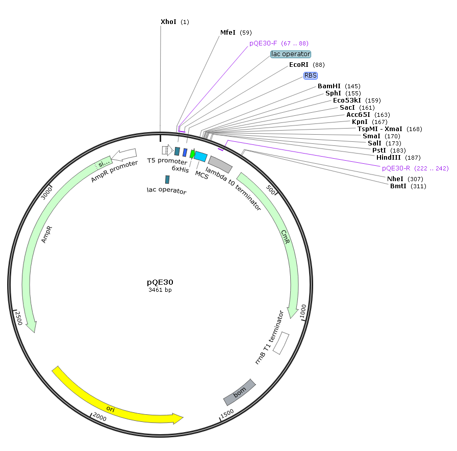 基本信息 載體類型: 大腸桿菌蛋白表達載體 載體抗性: Amp 載體標簽: N-His 篩選標記: / 啟動子: T5 表達水平: 低拷貝 載體大小: 3461bp 克隆方法: 多克隆位點,限制性內切酶 5' 測序引物: pQE30-F: 5’-AGCGGATAACAATTTCACACAG-3’ 3' 測序引物: pQE30-R: 5’-TTCTGAGGTCATTACTGGATC-3’ 備注: 如有侵權請產權持有人盡快聯系法務15927229196