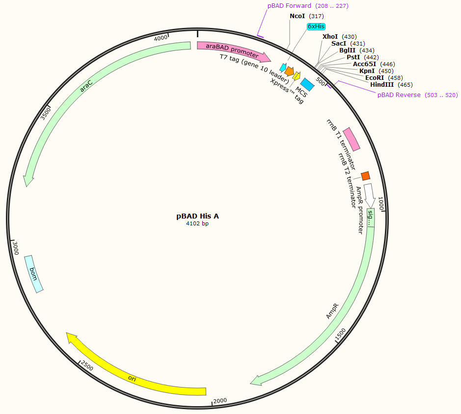 pBAD/His和PBAD/Myc-His載體質粒是衍生于pBR322載體。載體設計用來在大腸桿菌中進行可調節,劑量依賴性的表達和純化重組目的蛋白。使用大腸桿菌araBAD啟動子(pBAD)增強了大腸桿菌重組蛋白可溶性表達的水平。pBAD/His和pBAD/Myc His載體上的調節蛋白AraC能夠調控pBad啟動子。