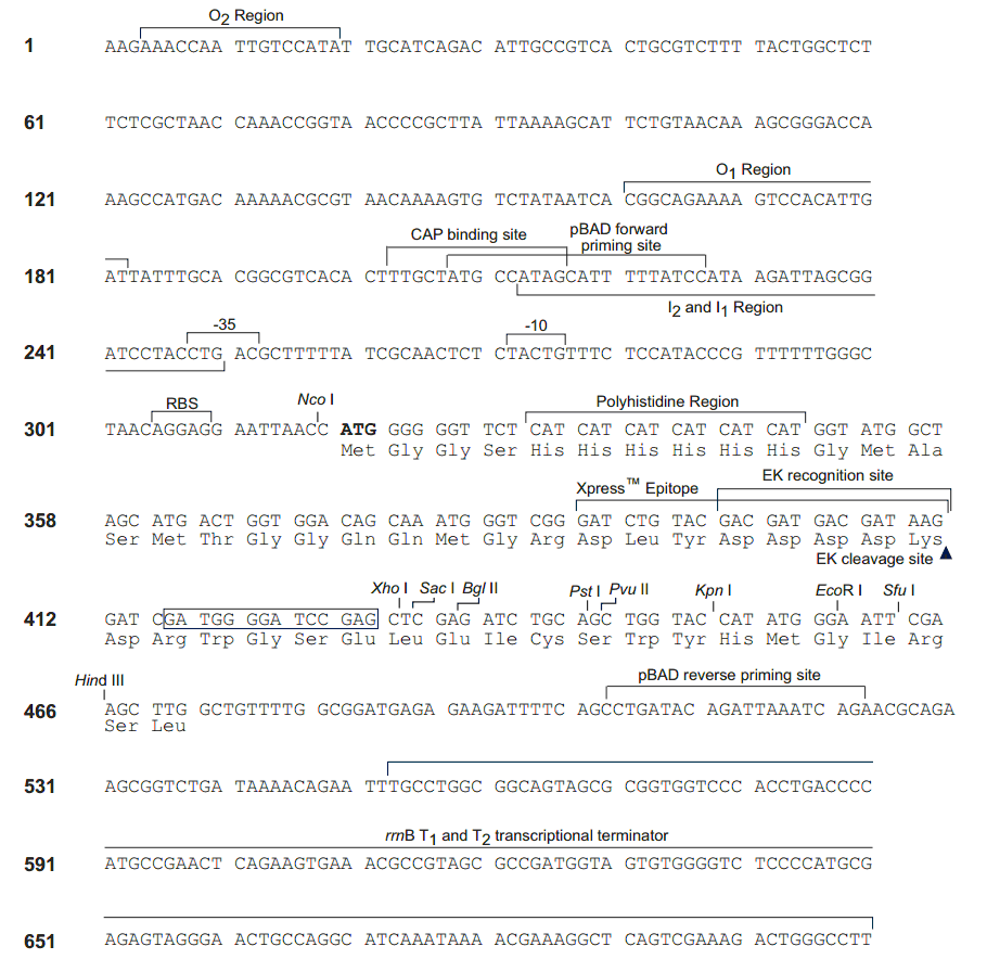 | 5' 測序引物: | pBAD Forward: 5′-ATGCCATAGCATTTTTATCC-3′ |