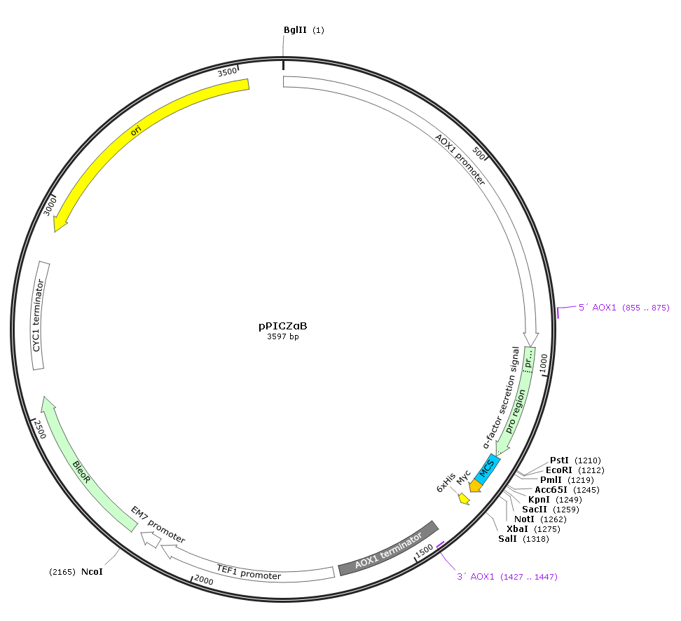 pPICZα A,B和C系列載體包含以下內容:①5'端含有AOX1啟動子的嚴格調控,利用甲醇誘導表達任何感興趣的基因(Ellis等,1985; Koutz等人,1989;tschopp等人,1987A)。②α-因子分泌信號能夠分泌性表達目的蛋白。③Zeocin抗性基因在大腸桿菌和畢赤酵母都能用于篩選(Baron等人,1992; Drocourt等人,1990)。④C-端含Myc和His標簽,可以用于檢測和純化重組蛋白。⑤pPICZ A, B, C三種讀碼框使得可以將基因克隆入載體而不發生任何移碼突變。
