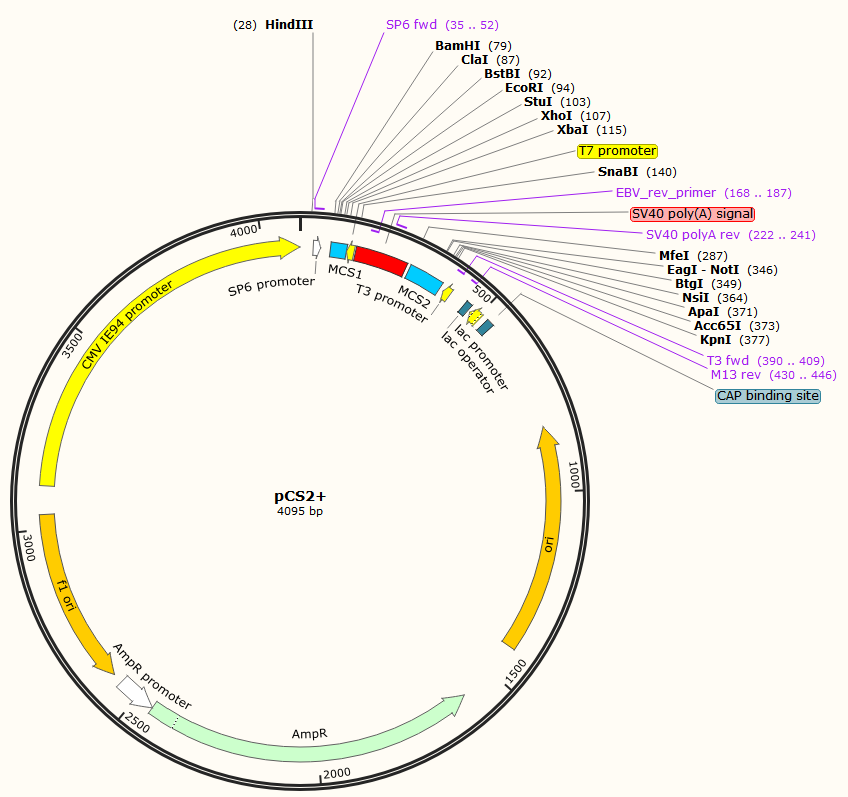 pCS2+載體能夠在多種細胞中進行高水平的瞬表達。表達細胞:原核細胞、哺乳動物、非洲爪蟾、鳥類、斑馬魚。pCS2+載體同時也能進行體外轉錄和翻譯。