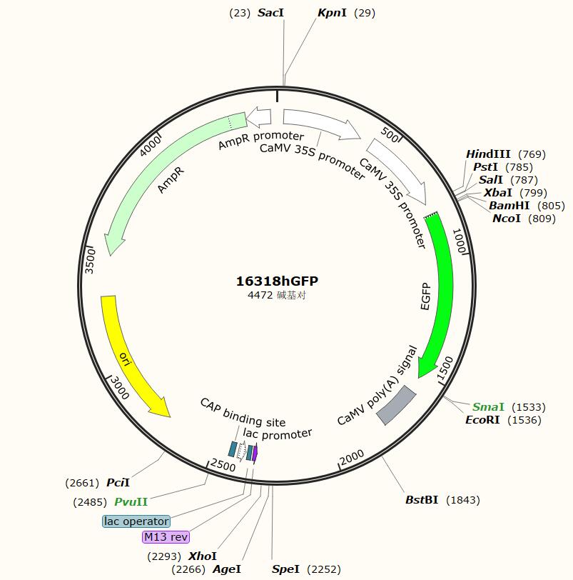 16318-hGFP為植物熒光表達載體,雙35S啟動子,高效表達融合蛋白GFP,多用于植物亞細胞定位實驗。