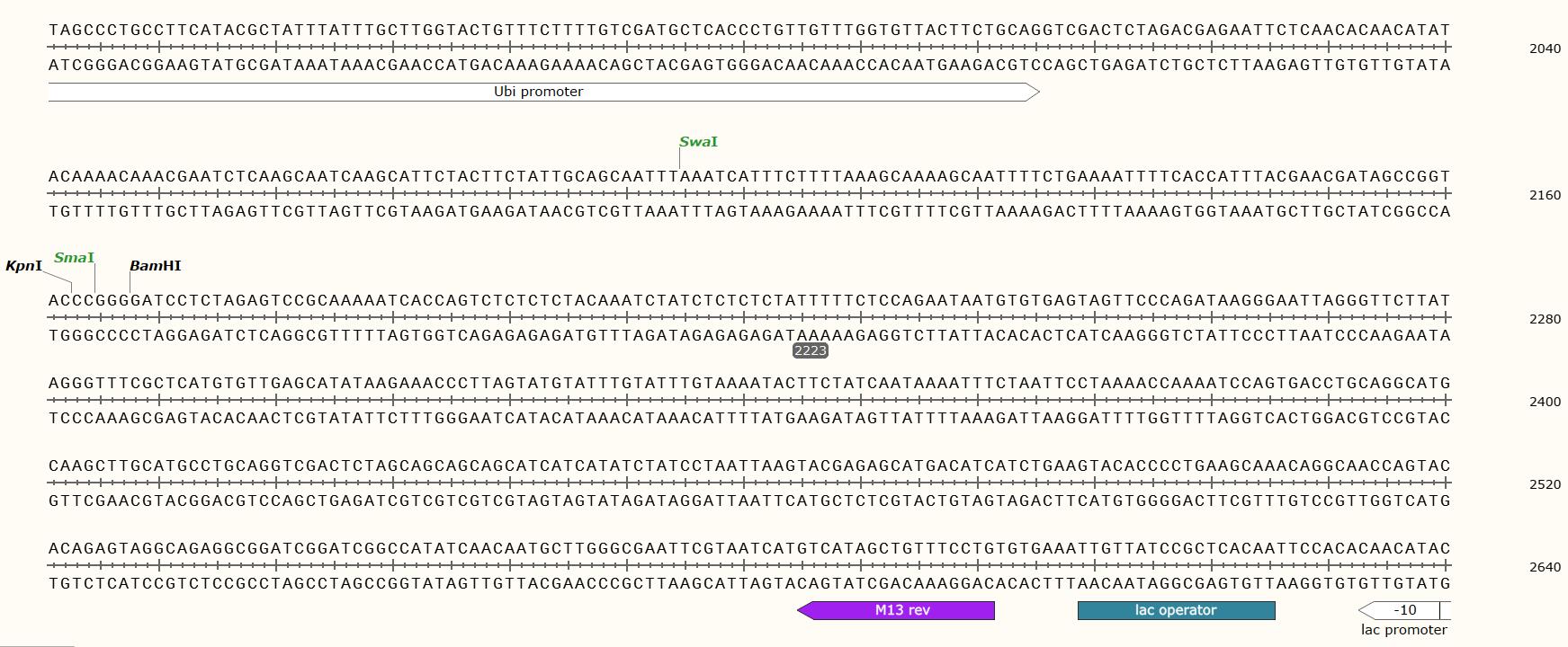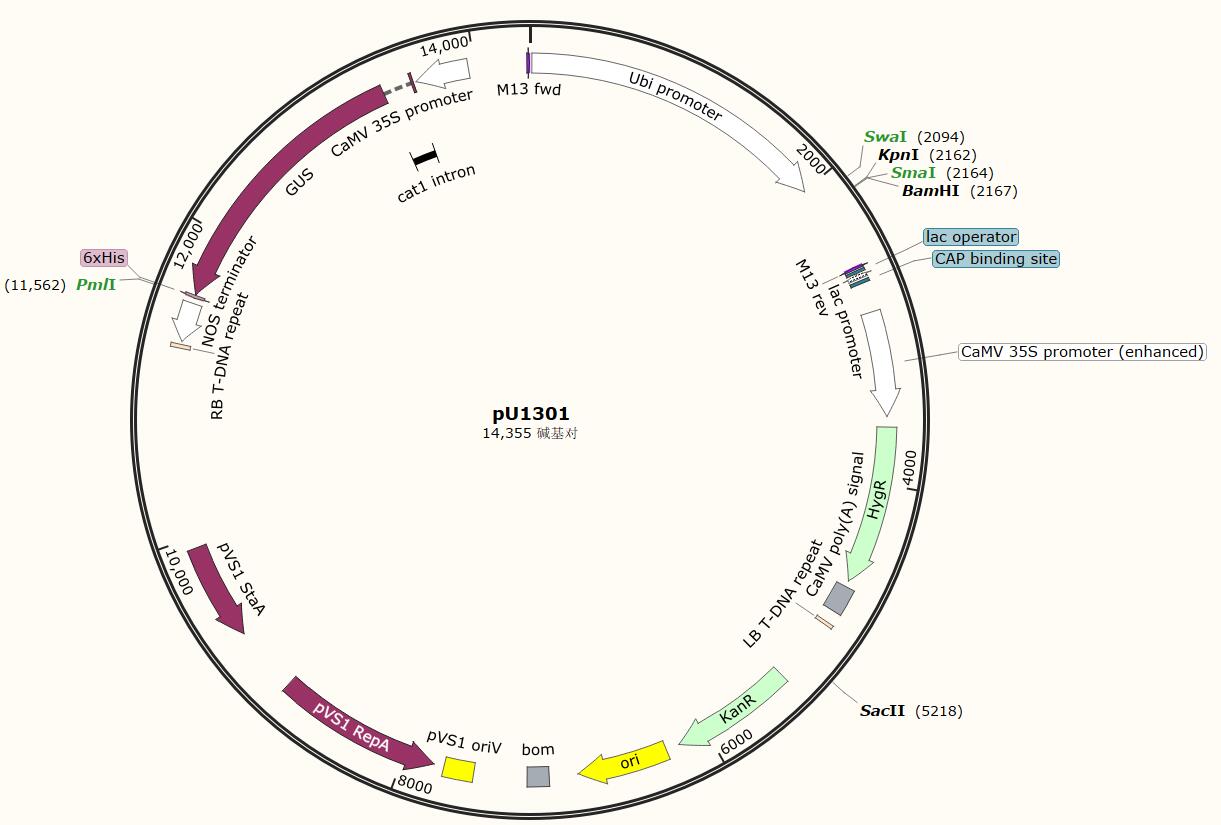 | 5' 測序引物: | UBI primer: 5’-TTGTCGATGCTCACCCTGTTG-3’; 或pU1301UF: 5’-ATATACAAAACAAACGAA-3’ |