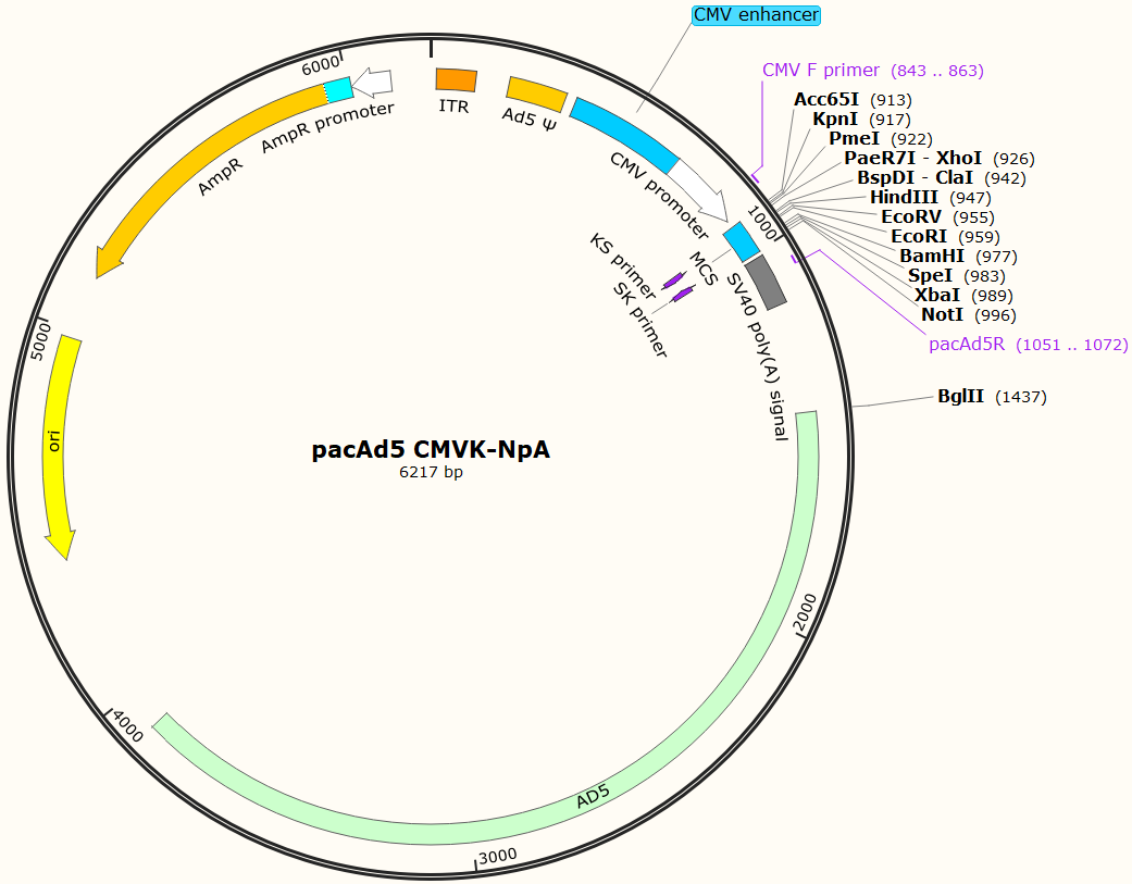 pacAd5 CMVK-NpA質粒是一個腺病毒質粒,CMV啟動子驅動目的基因的表達。