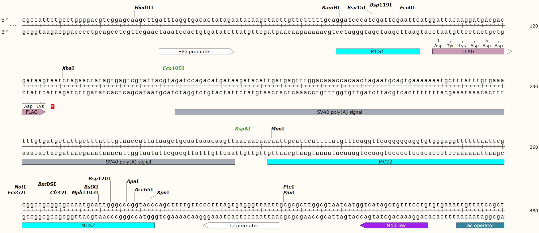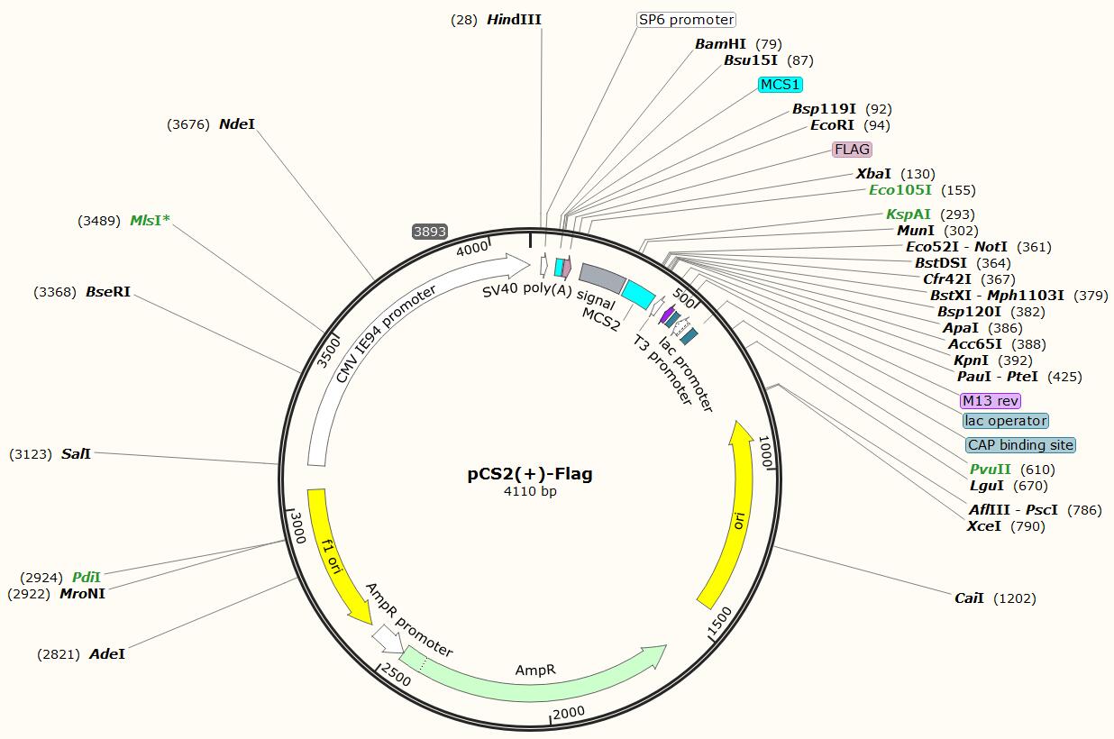 pCS2+載體能夠在多種細胞中進行高水平的瞬表達。表達細胞:原核細胞、哺乳動物、非洲爪蟾、鳥類、斑馬魚。pCS2+載體同時也能進行體外轉錄和翻譯。本載體在pCS2+載體基礎上改造而來,增加了Flag蛋白標簽,便于檢測和分離。