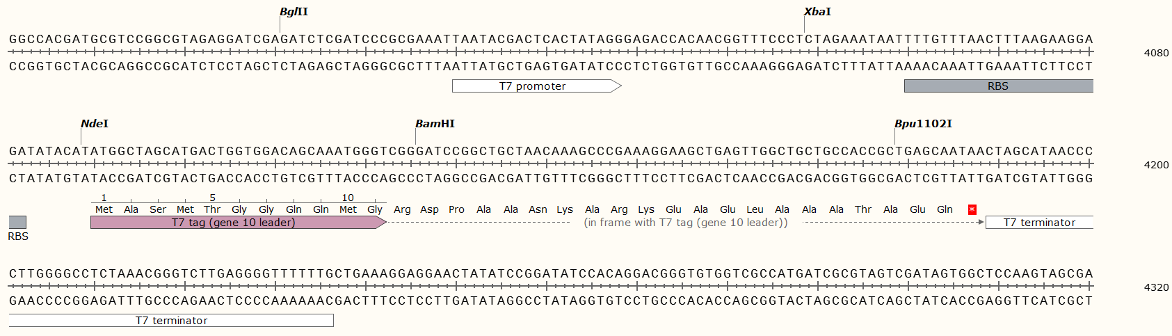 Bacterial expression vector with a BamHI cloning site. For alternative reading frames, use pET-3a or pET-3c.