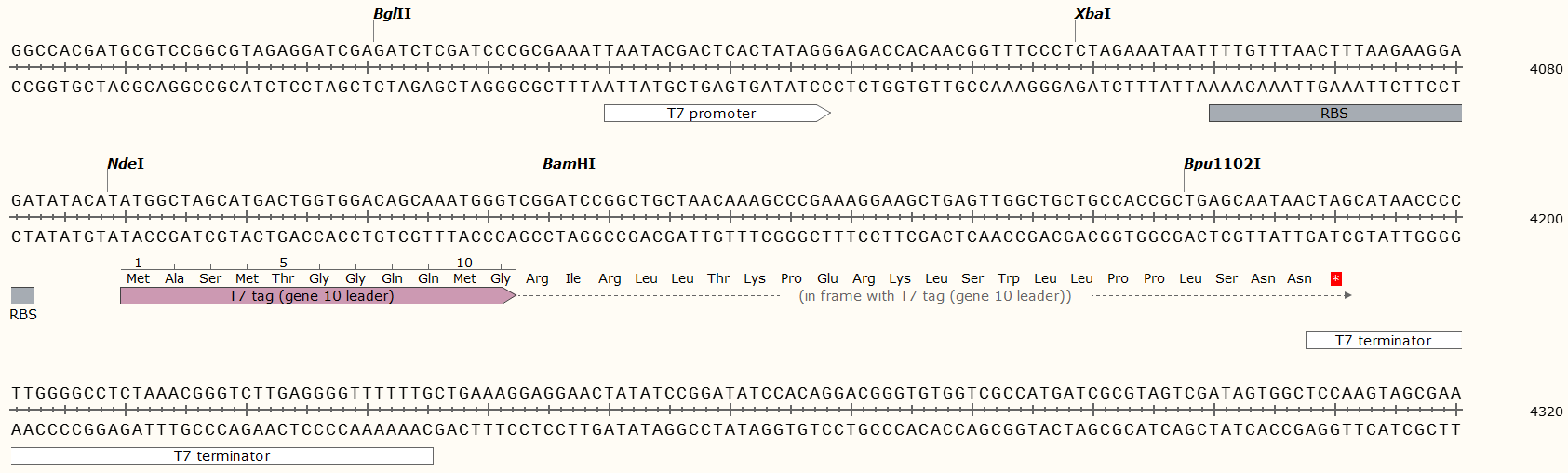 Bacterial expression vector with a BamHI cloning site. For alternative reading frames, use pET-3a or pET-3c.