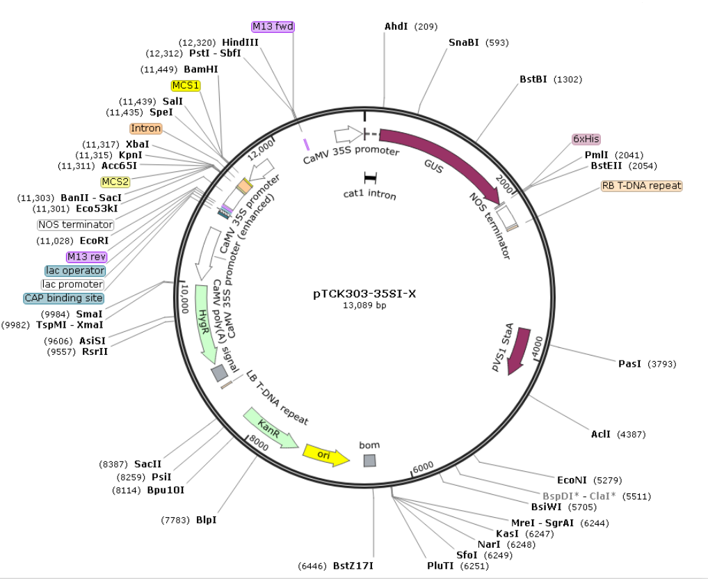 | 載體類型: | 植物表達載體, RNAi干擾載體,GUS報告載體 |