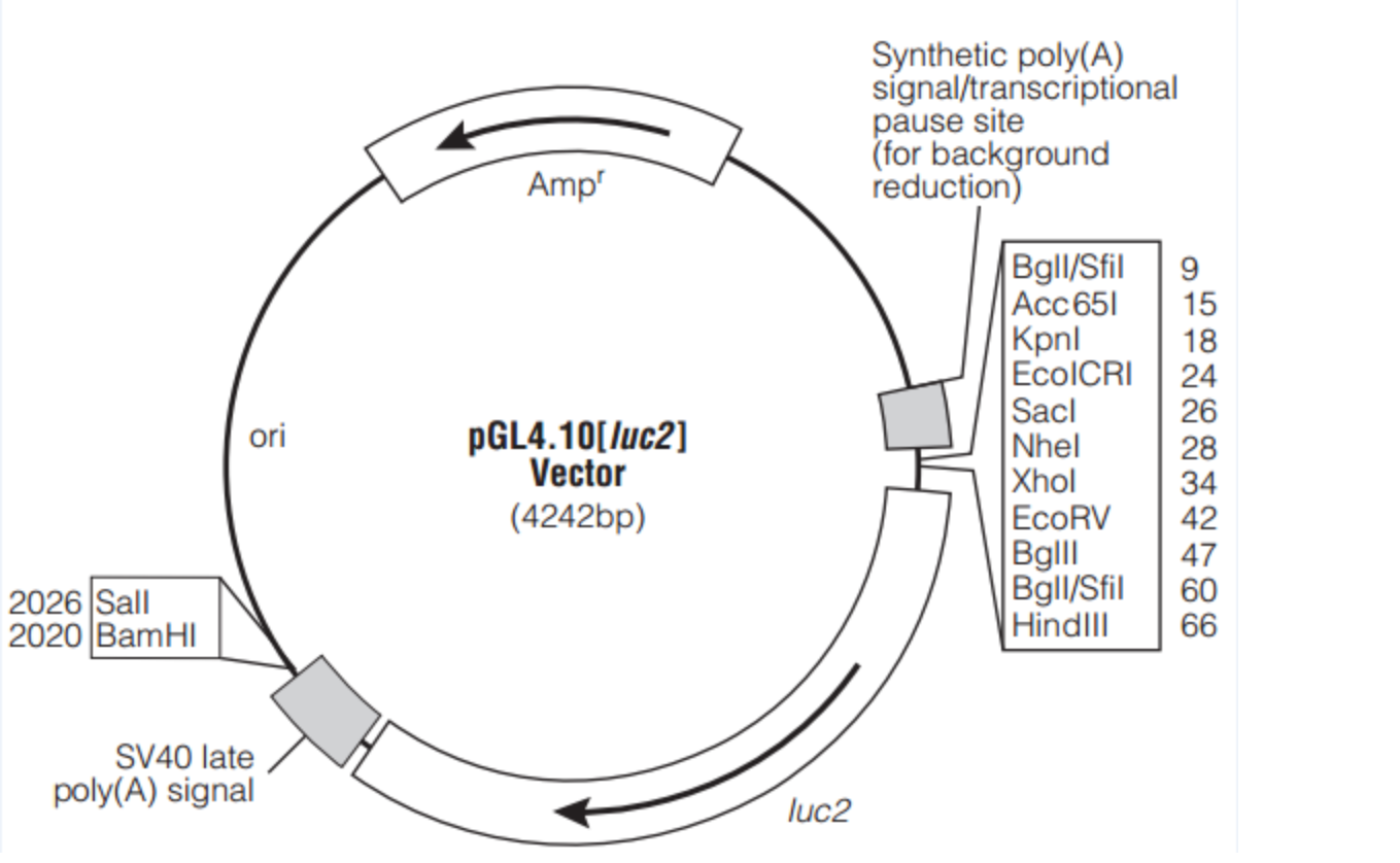 The pGL4.10[luc2] Vector is a basic vector with no promoter. However, it contains a multiple cloning region to allow cloning of a promoter of choice.