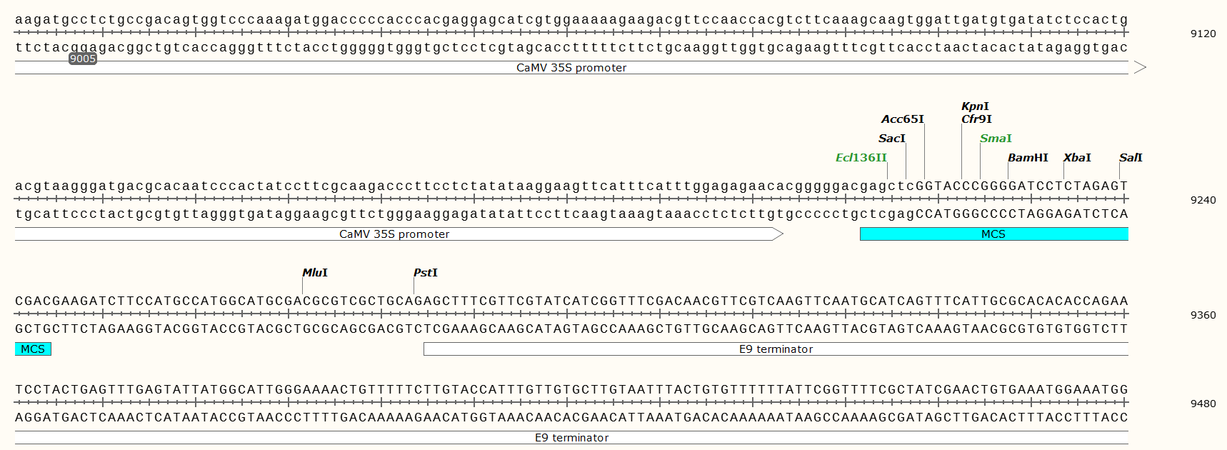 在pCambia 2300的EcoRI和HindIII之間插入了35S啟動子、MCS和E9 終止子序列。