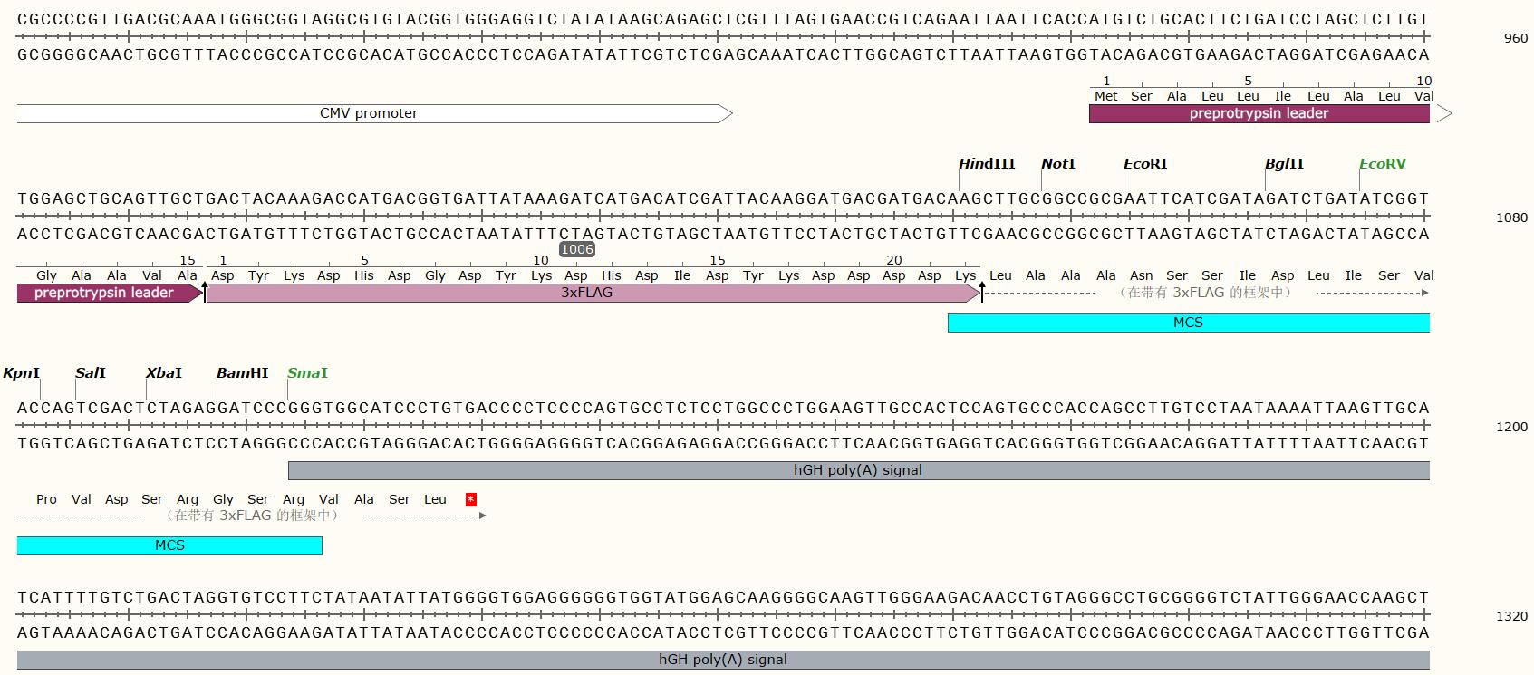 CMV啟動子: Our mammalian expression vectors contain the strong CMV promoter for high-level constitutive expression in mammalian cells. The strong human cytomegalovirus (CMV) promoter regulatory region drives constitutive protein expression levels as high as 1 mg/L in COS cells. For less potent cell lines, protein levels are typically ~0.1 mg/L. The presence of the SV40 replication origin will result in high levels of DNA replication in SV40 replication permissive COS cells. Vectors containing the preprotrypsin leader (PPT) sequence direct secretion of FLAG fusion proteins into the culture medium for purification using ANTI-FLAG antibodies, resins, and plates.