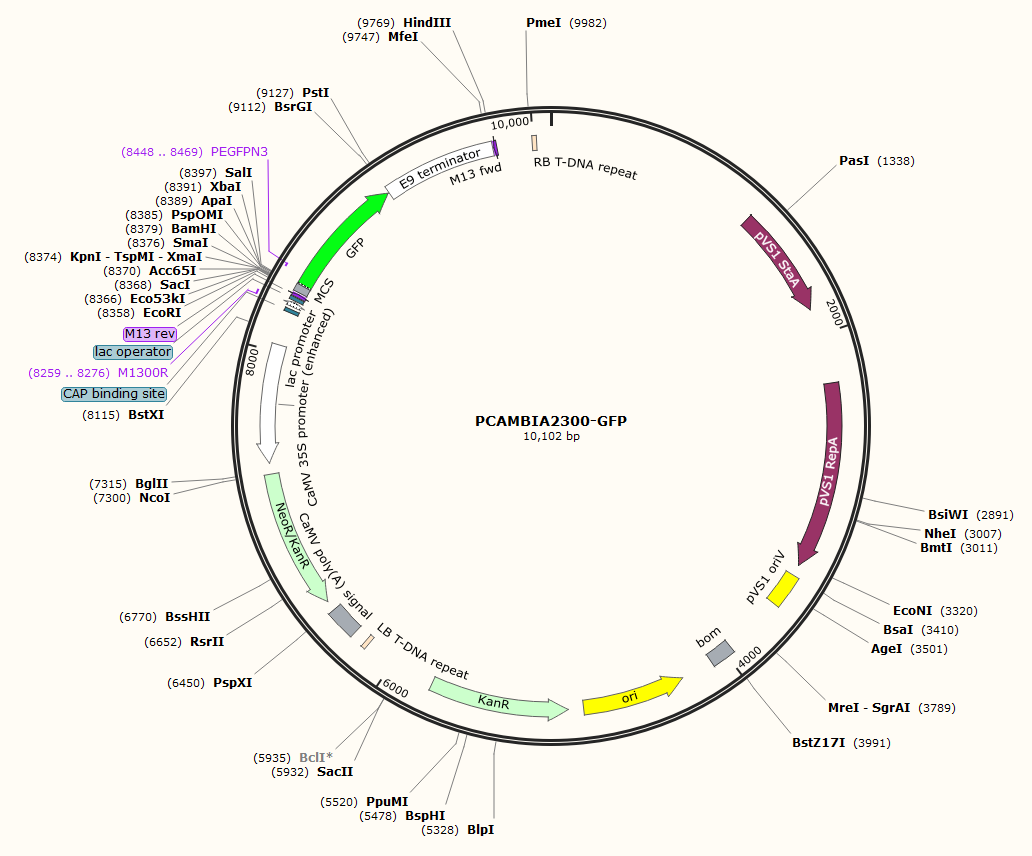 在pCambia 2300的SalII和HindIII之間插入了GFP和E9終止子序列,同時在BamHI和XbaI之間增加了酶切位點ApaI。