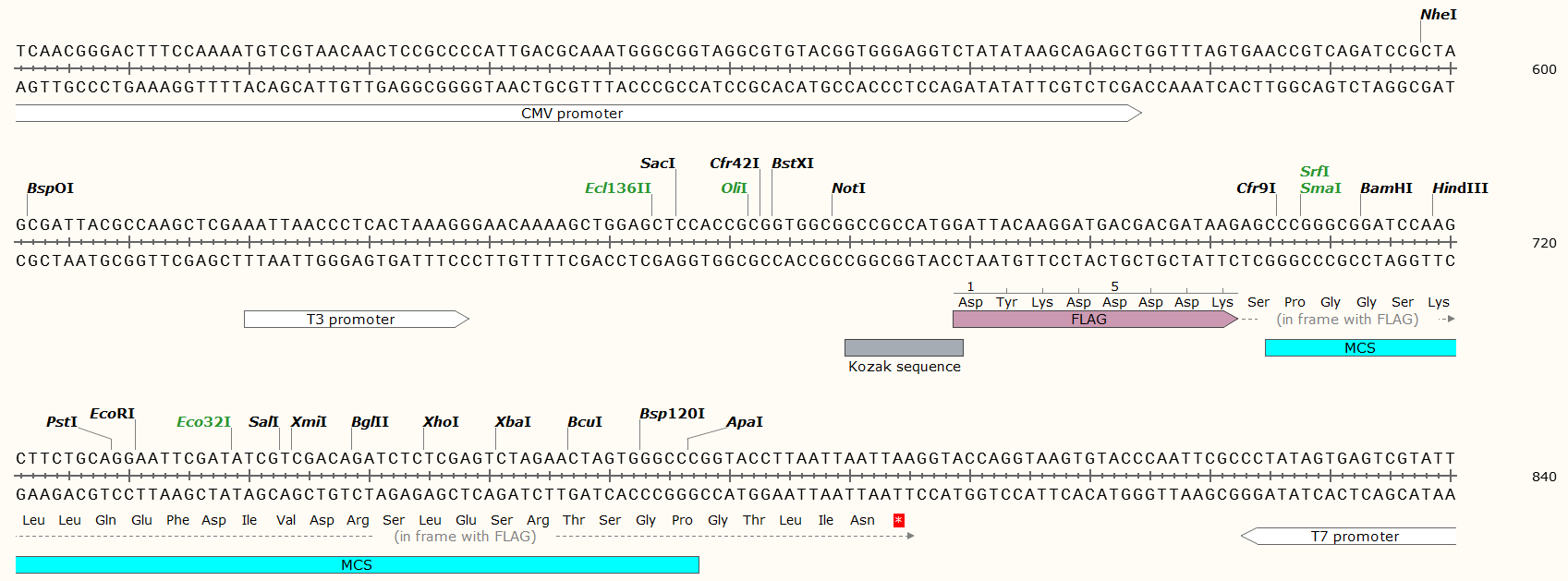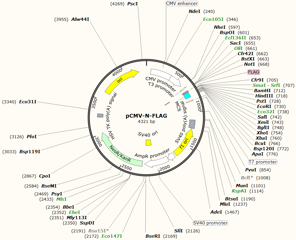含有CMV啟動子可以高效啟動目的蛋白在細胞中的表達;在多克隆位點的5'端含有一個可以編碼Flag標簽的序列,因此可以表達出含有Flag標簽的融合蛋白,可以方便地使用抗Flag的抗體來識別目的蛋白,有利于目的蛋白檢測和分離純化。質粒為卡那霉素抗性。轉染細胞后,可使用G418篩選穩定表達目的蛋白的細胞株。