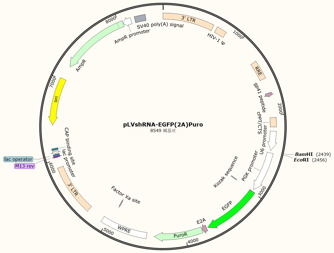 pLVshRNA-EGFP(2A)Puro質粒是基于HIV1的慢病毒RNA干擾載體,用于表達人工設計合成的shRNA,干擾目標基因的表達。