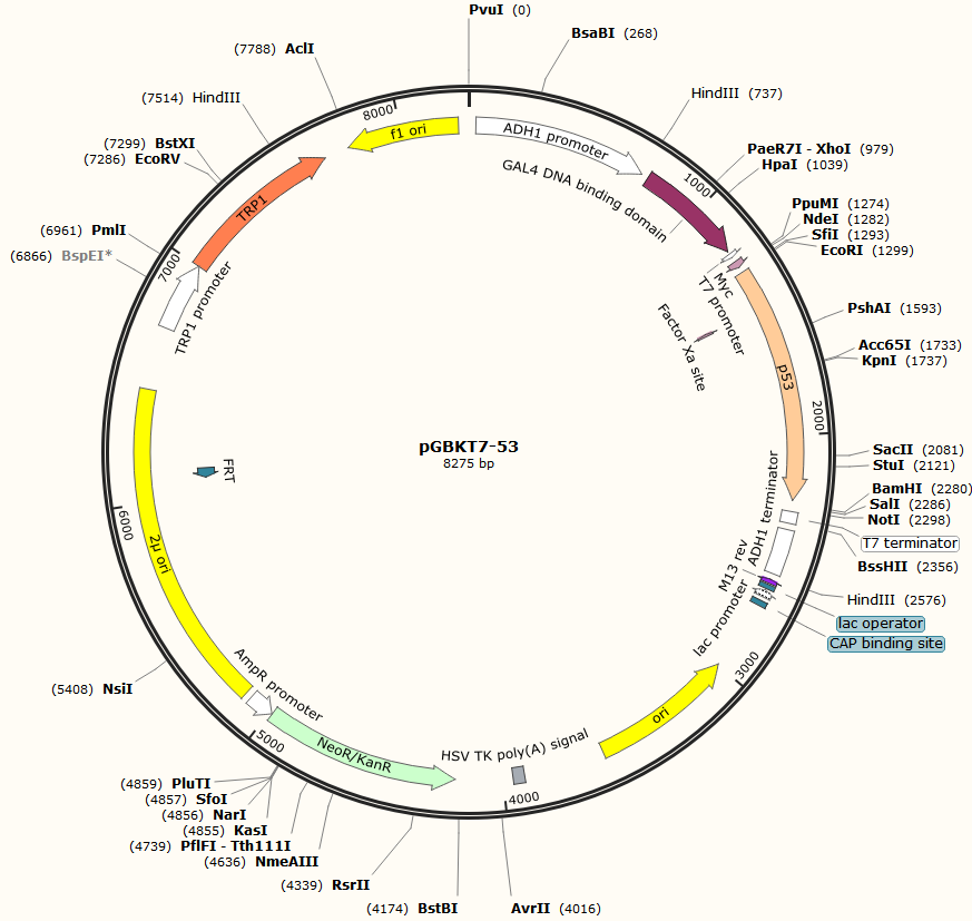 Yeast two-hybrid systems provide a sensitive method for detecting relatively weak and transient protein interactions. Such interactions may not be biochemically detectable, but may be critical for proper functioning of complex biological systems. pGBKT7-53 and pGADT7-T encode fusions between the GAL4 DNA-BD and AD and murine p53 and SV40 large T-antigen, respectively. p53 and large T-antigen interact in a yeast two-hybrid assay.