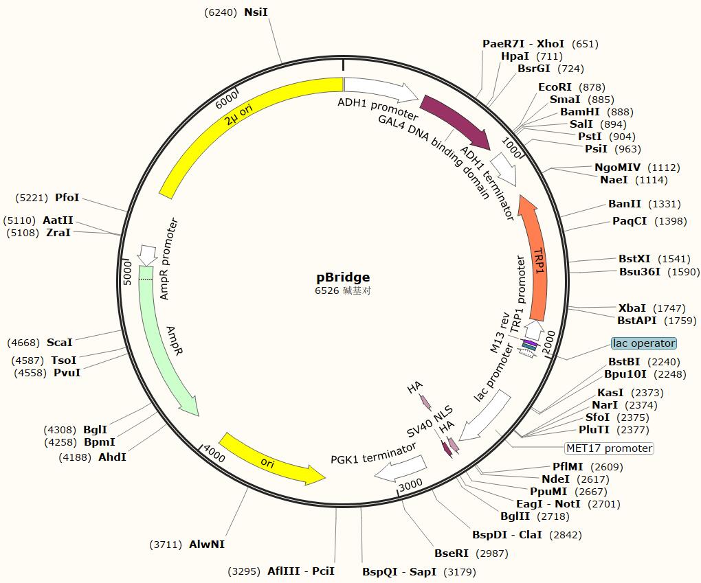 載體說明 pBridgeTM expresses two proteins: a DNA-binding domain fusion, and an additional protein (1–3). pBridge thus allows establishment of three-hybrid systems when used in combination with an activation domain fusion vector and yeast strains from any of CLONTECH's GAL4-based two-hybrid systems (#K1604-1, #K1605-1, #K1612-1). This vector generates a hybrid protein that contains the sequences for the GAL4 DNA-binding domain (DNA-BD; a.a. 1–147) and the sequence cloned into MCS I. The fusion protein is expressed in yeast host cells from the constitutive ADH1 promoter; transcription is terminated at the ADH1 transcription termination signal. The hybrid protein is targeted to the yeast nucleus by nuclear localization sequences (NLS) that are an intrinsic part of the GAL4 DNA-BD (3). An additional gene of interest can be cloned into MCS II which is located downstream of an HA epitope and a second NLS. The resulting fusion protein is conditionally expressed from the MET25 promoter in response to methionine levels in the medium; i.e., it is repressed in the presence of 1 mM methionine and expressed in the absence of methionine (1).
