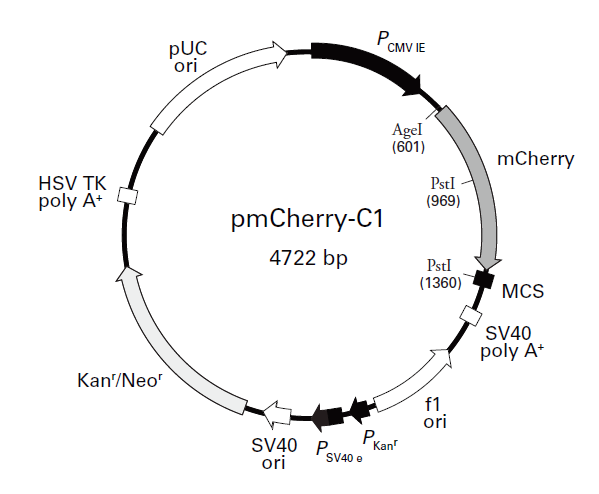 載體描述 pmCherry-C1 is a mammalian expression vector designed to express a protein of interest fused to the C-terminus of mCherry, a mutant fluorescent protein derived from the tetrameric Discosoma sp. red fluorescent protein, DsRed (1). The excitation and emission maxima of the native mCherry protein are 587 nm and 610 nm, respectively. Expression of fusion proteins that retain the fluorescent properties of the unmodified mCherry protein can be monitored by flow cytometry and their localization in vivo can be determined by fluorescence microscopy.