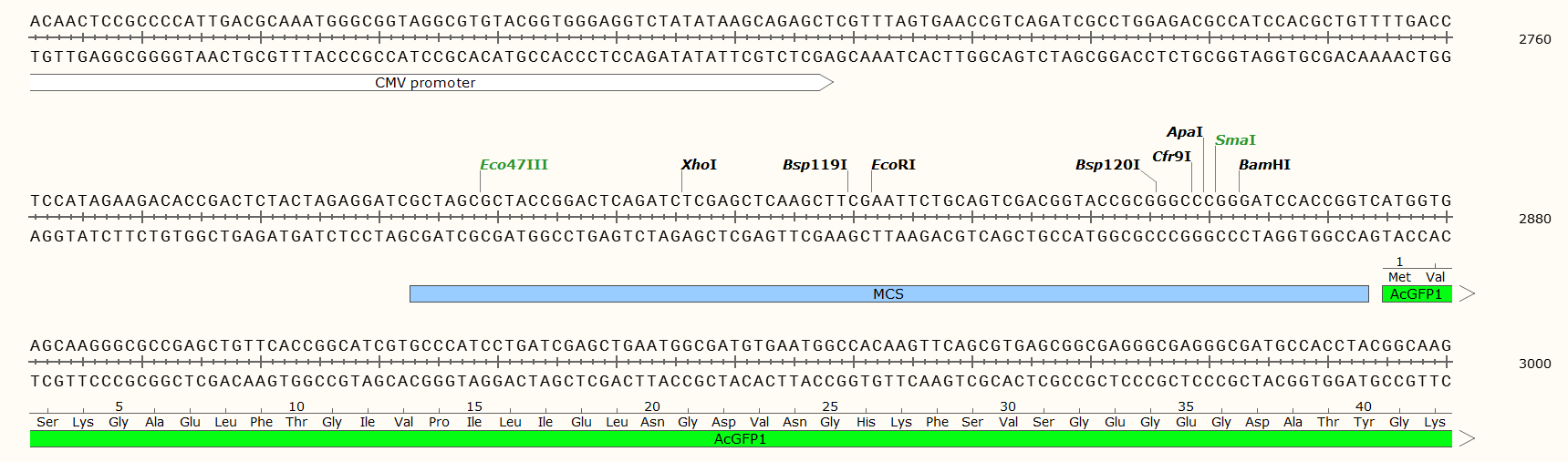 | 3' 測序引物: | AcGFP1R: GATGAACTTCAGGGTCAG |