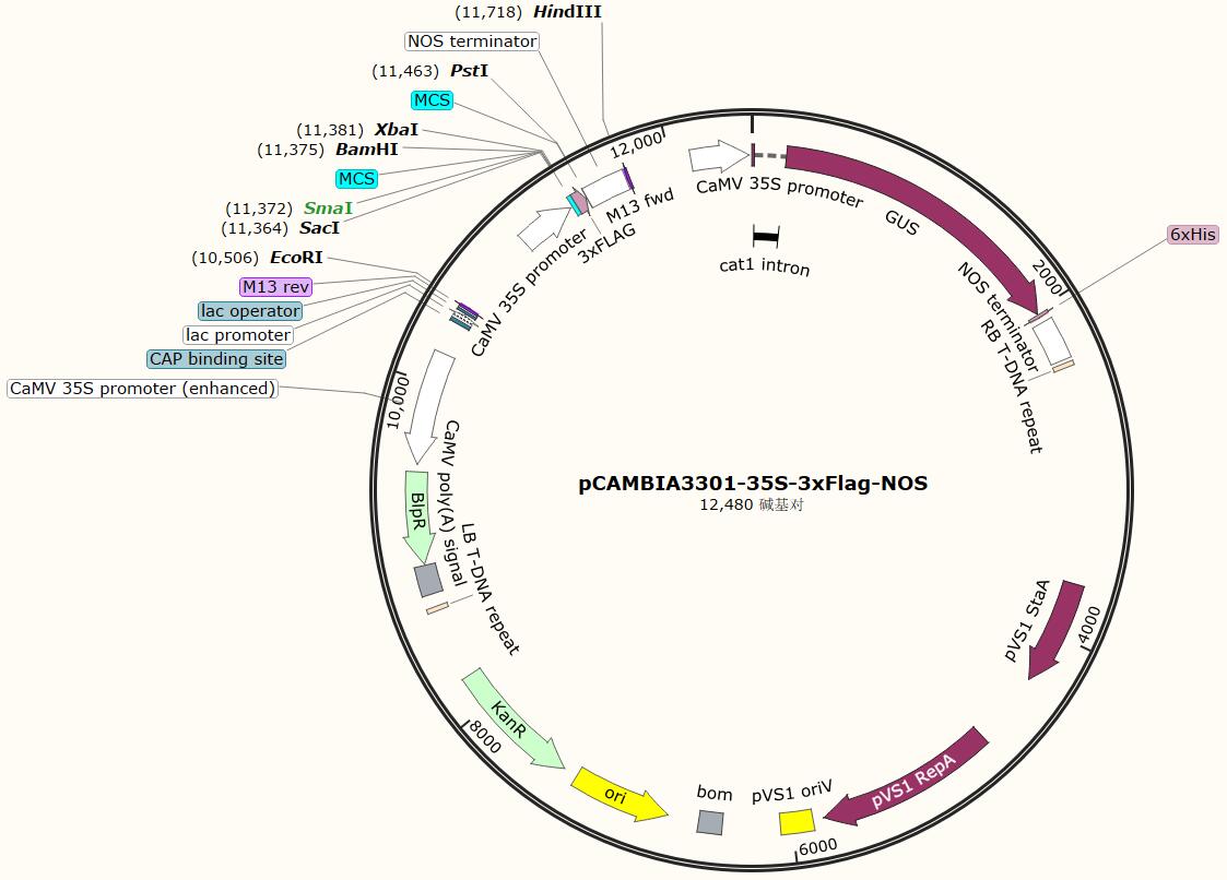 載體類型: 植物表達載體 載體抗性: Kan 啟動子: 35S 載體大小: 12480bp 克隆方法: 多克隆位點,限制性內切酶 5' 測序引物: / 3' 測序引物: / 備注: 如有侵權請產權持有人盡快聯系法務15927229196