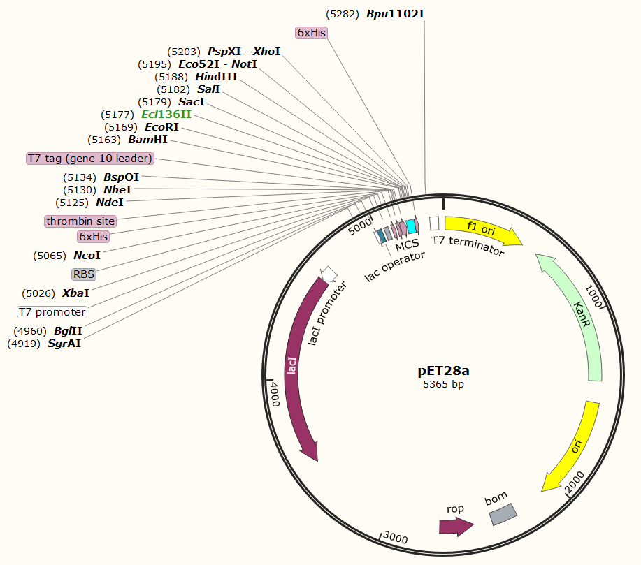 pET-28a-c(+)載體帶有一個N端的His/Thrombin/T7蛋白標簽,同時含有一個可以選擇的C端His標簽。pET28a載體的單一的多克隆位點見上面的環狀質粒圖譜。注意:載體序列是以pBR322質粒的編碼規矩進行編碼的,所以T7蛋白表達區在質粒圖譜上面是反向的。