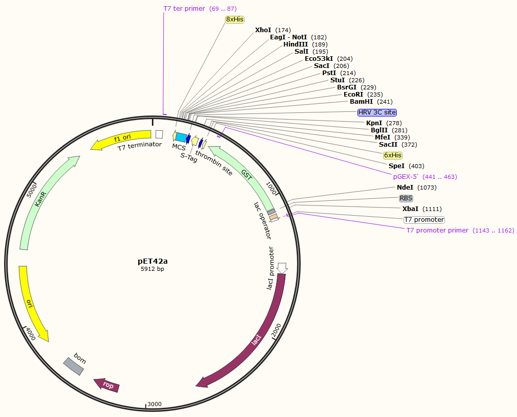 轉導生物公司pET42a載體,在BamHI和KpnI酶切位點間,用HRV 3C蛋白酶切位點代替Factor Xa,可以將融合表達的GST標簽完全切除。