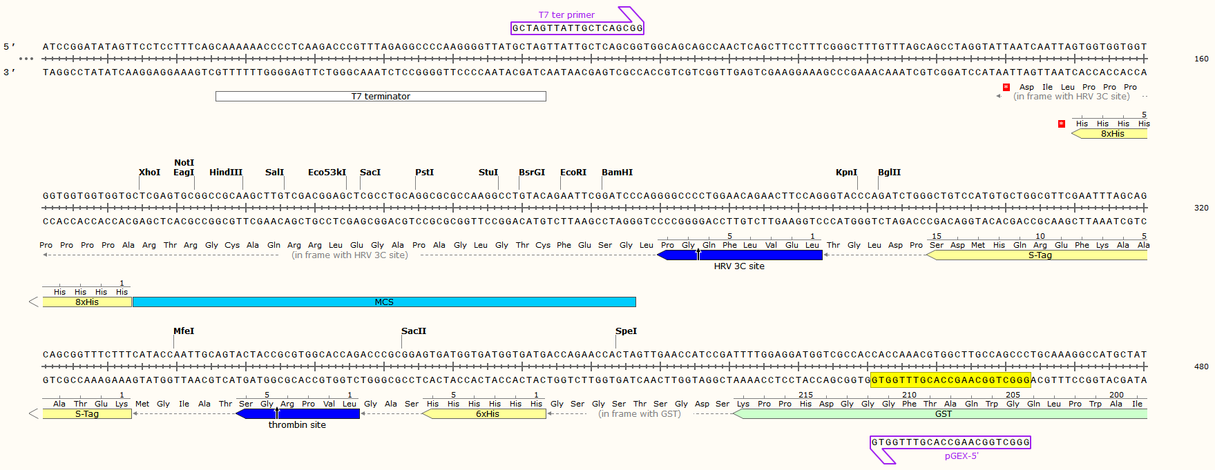 | 5' 測序引物: | T7: 5'-TAATACGACTCACTATAGGG-3'; pGEX-5': 5'-GGGCTGGCAAGCCACGTTTGGTG-3' |
