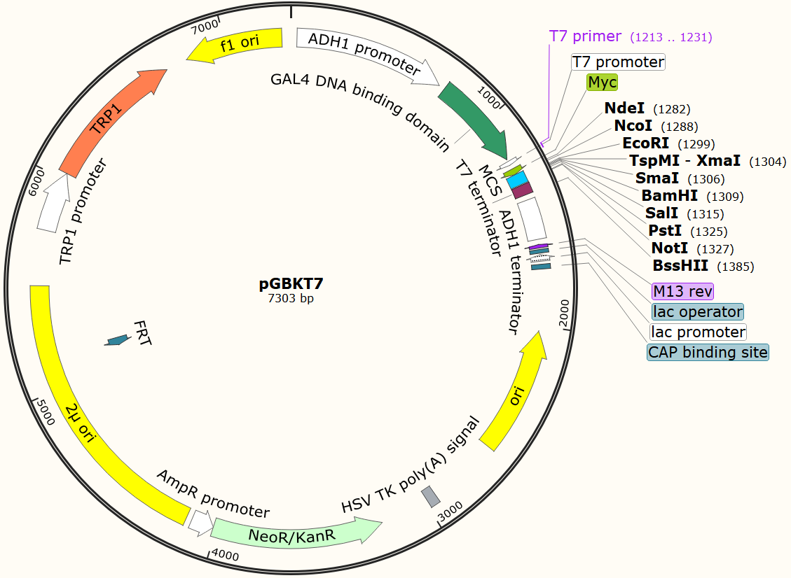 載體類型: 釀酒酵母雙雜交系統載體;誘餌(BD)質粒 載體抗性: Kan 載體標簽: C-Myc 啟動子: ADH1 表達水平: 高拷貝 載體大小: 7303bp 克隆方法: 多克隆位點,限制性內切酶 5' 測序引物: T7: 5’-TAATACGACTCACTATAGGG-3’ 3' 測序引物: -- 備注: 如有侵權請產權持有人盡快聯系法務15927229196