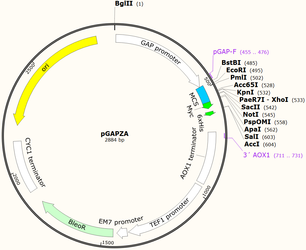 pGAPZ A,B,和C載體(2.9 KB)和pGAPZα A,B,和C(3.1 KB)載體使用GAP啟動子在畢赤酵母中穩定表達重組蛋白。重組蛋白表達為帶有C-末端myc抗原表位和C端His標簽的融合蛋白。此外,pGAPZα表達的融合蛋白在N-端帶有釀酒酵母(Saccharomyces cerevisiae)的α-因子分泌信號肽。這兩個系列的載體都提供三個不同讀碼框的載體,以方便克隆的帶有C-端標簽和/或N-末端分泌信號肽的載體中。
