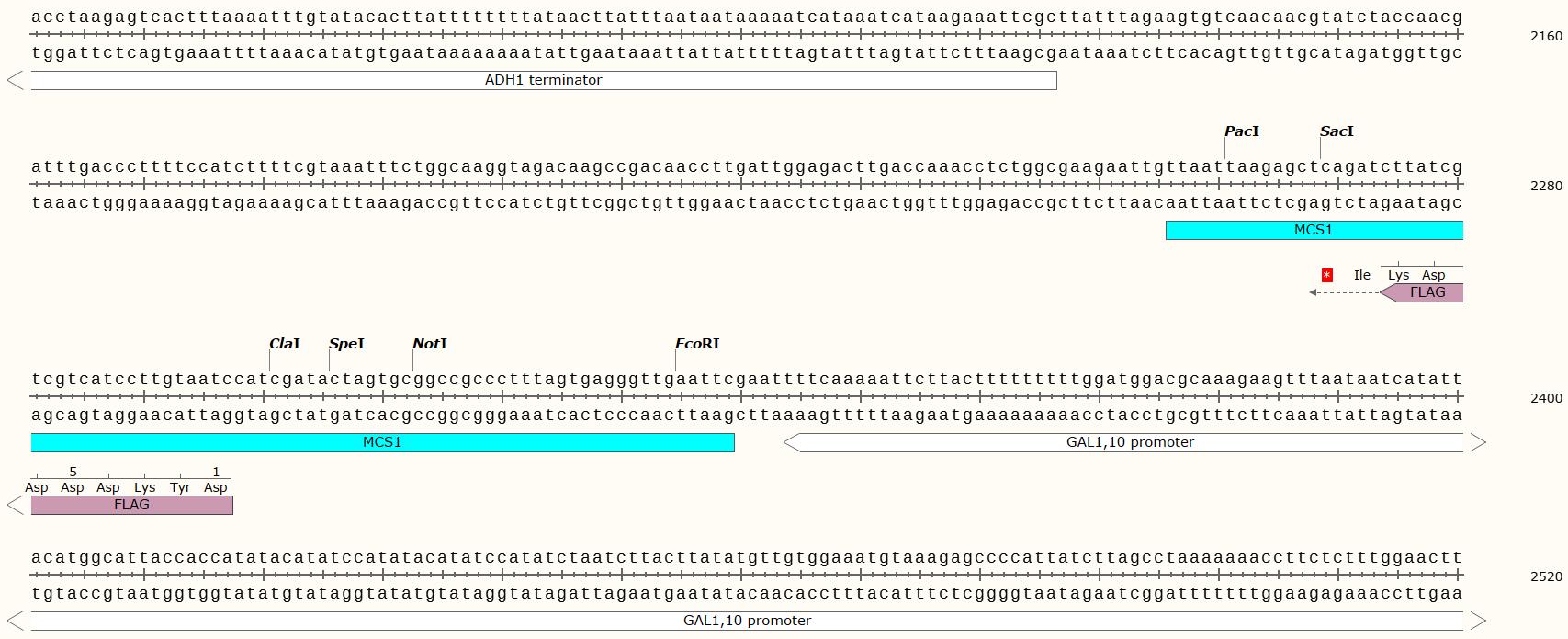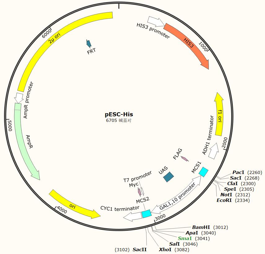 載體類型: 釀酒酵母蛋白表達載體 載體抗性: Amp 載體標簽: C-Flag, C-Myc 篩選標記: His3 啟動子: GAL1和GAL10 表達水平: 高拷貝 載體大小: 5963 bp 克隆方法: 多克隆位點,限制性內切酶 5' 測序引物: GAL1-F: ATTTTCGGTTTGTATTACTTC; GAL10-F: GGTGGTAATGCCATGTAATATG 3' 測序引物: GALI-R: GTTCTTAATACTAACATAACT GAL10-R: GGCAAGGTAGACAAGCCGACAAC 備注: 如有侵權請產權持有人盡快聯系法務15927229196