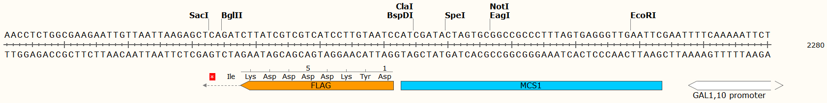 載體類型: 釀酒酵母蛋白表達載體 載體抗性: Amp 載體標簽: C-Flag, C-Myc 篩選標記: His3 啟動子: GAL1和GAL10 表達水平: 高拷貝 載體大小: 6631 bp 克隆方法: 多克隆位點,限制性內切酶 5' 測序引物: GAL1-F: 5’-ATTTTCGGTTTGTATTACTTC-3’; GAL10-F: 5’-GGTGGTAATGCCATGTAATATG-3’ 3' 測序引物: GALI-R: 5’-GTTCTTAATACTAACATAACT-3’ GAL10-R: 5’-GGCAAGGTAGACAAGCCGACAAC-3’ 備注: 如有侵權請產權持有人盡快聯系法務15927229196