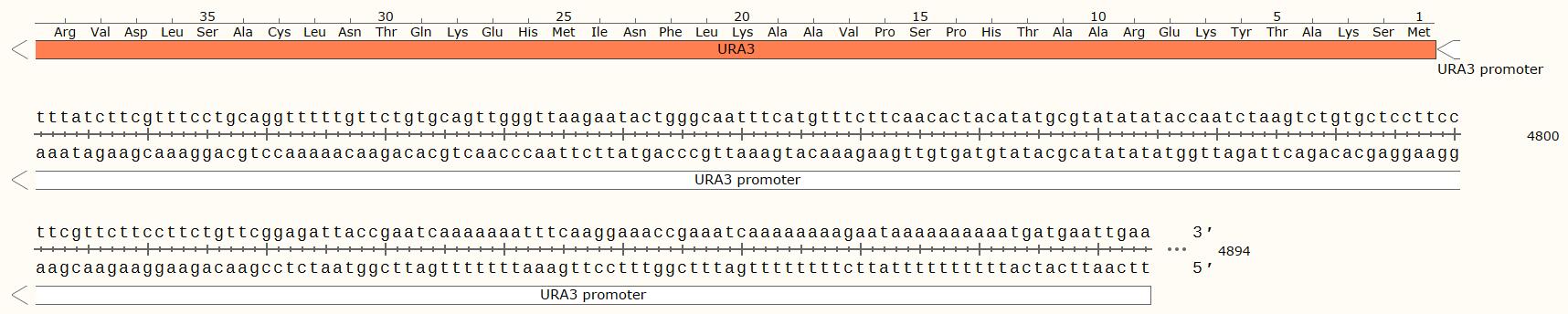 pABAI cannot be propagated episomally in yeast; it can only be stably maintained through integration into the host genome. Integration is accomplished via homologous recombination between the vector’s URA3 gene and the ura3-52 locus of the yeast strain provided in the Matchmaker Gold Yeast One-Hybrid System. URA3 is a nutritional marker that can also be used for selection of recombinant yeast. The vector also contains a Col E1 origin of replication and an ampicillin resistance gene (Ampr) for propagation and selection in E.coli.