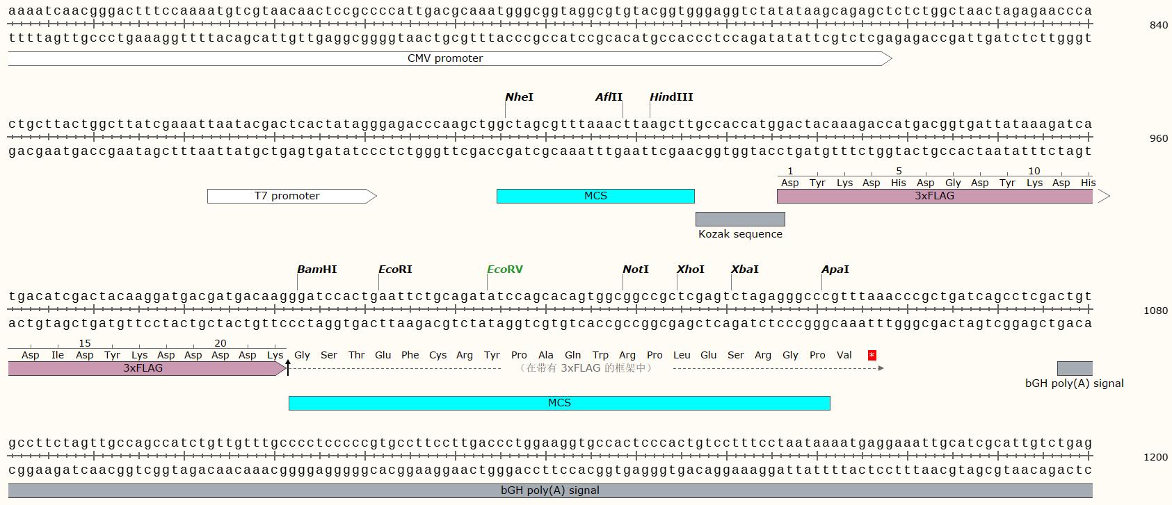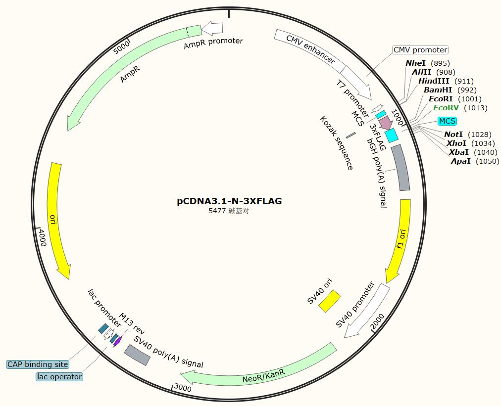 基本信息 載體類型: 哺乳動物細胞表達載體 載體抗性: Amp 載體標簽: 3Flag 篩選標記: Neomycin / G418 啟動子: CMV 表達水平: 高 載體大小: 5477 克隆方法: 多克隆位點,限制性內切酶 5' 測序引物: pcDNA3.1-F:CTAGAGAACCCACTGCTTAC 3' 測序引物: pcDNA3.1-R (BGH-R):TAGAAGGCACAGTCGAGG 備注: 如有侵權請產權持有人盡快聯系法務15927229196
